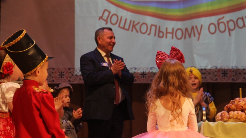 На сцене с юными воспитанниками детского сада "Радуга" глава района спел и сплясал "Каравай".