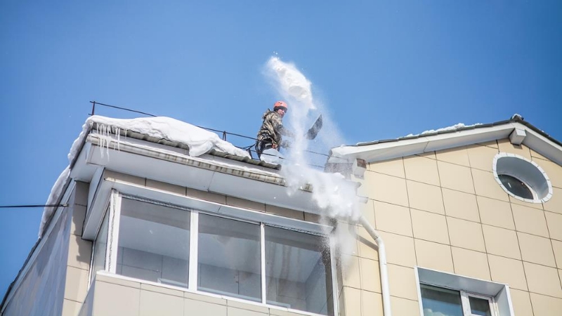 В зимнее время должна быть организована своевременная очистка кровель от снега, наледи и обледенений. Очистка крыш от снега (наледи) со сбросом его на тротуары допускается только в светлое время суток с поверхности ската кровли, обращенного в сторону улицы. Сброс снега с остальных скатов кровли, а также плоских кровель должен производиться на внутренние дворовые территории. Перед сбросом снега необходимо провести охранные мероприятия, обеспечивающие безопасность движения транспортных средств и прохода пешеходов, с установкой предупреждающих ограничительных средств на период уборки снега с кровель. Сброшенные с кровель зданий снег (наледь) следует вывозить не позднее 24 часов после сброса, за исключением жилищного фонда. При сбрасывании снега с крыш должны быть приняты меры, обеспечивающие полную сохранность деревьев, кустарников, воздушных линий уличного электроосвещения, растяжек, средств размещения информации, дорожных знаков, линий связи и т.п.
