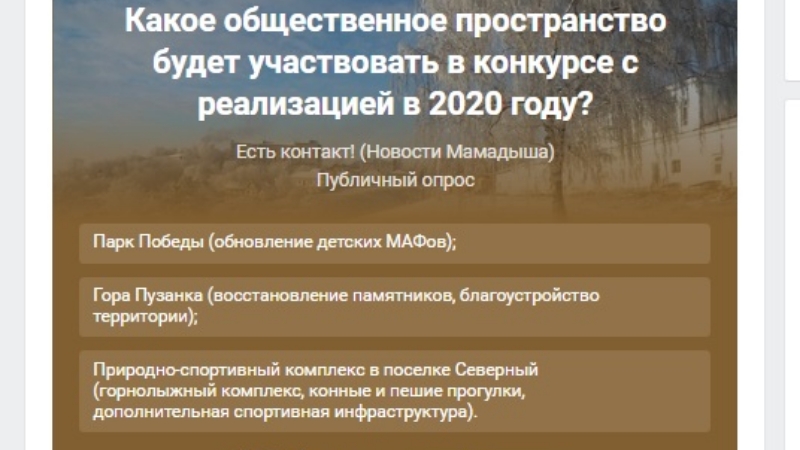 Голосование проходит в группе "Есть контакт" в социальной сети "Вконтакте". Можно пройти по ссылке: https://vk.com/novostimamadyisha?w=wall-31791649_107654