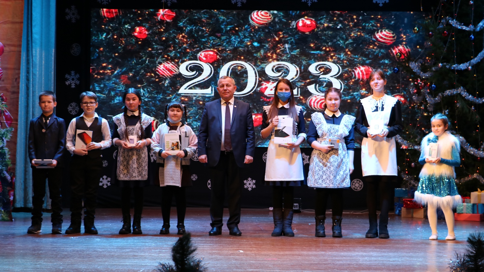 Глава района Анатолий Иванов поблагодарил мамадышских школьников за целеустремленность, амбициозность, с которыми они участвуют в школьных олимпиадах, творческих конкурсах, спортивных состязаниях, общественной жизни. Со словами признательности, пожеланиями счастливого Нового года он выступил на традиционной Елке для одаренных детей. В этом году приглашение на праздник получили 360 детей, в том числе школьники из семей мобилизованных граждан.
