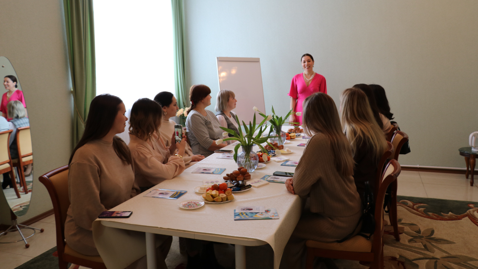 Сегодня в отделе ЗАГС прошла встреча мамочек, находящихся в декретном отпуске. За круглым столом женщины поделились опытом, обсудили вопросы, касающиеся воспитания детей, организации быта и поддержания баланса между материнством и самореализацией. Перед мамами выступили спикеры, дали ценные советы о том, как справляться со стрессом, избегать выгорания и находить время для себя. К примеру, участница встречи, врач косметолог Анжела Степанова поделились секретами красоты и ухода за кожей. А Назиля Хасанова рассказала, о том, как ее детское увлечение шить одежду для кукол переросло в свой маленький бизнес.