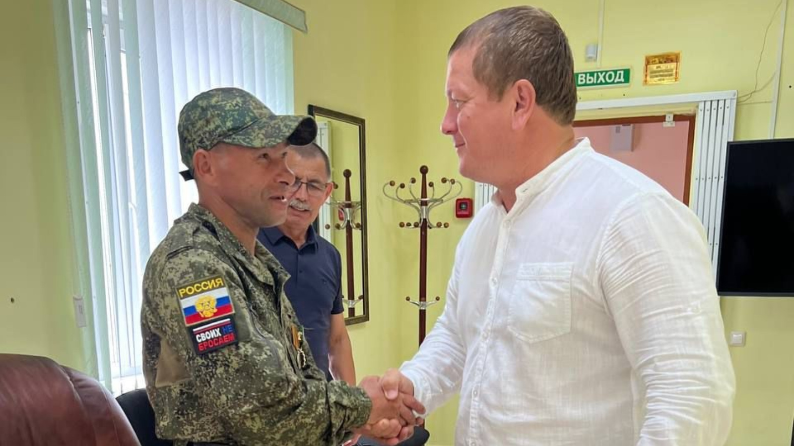 Чуть больше года назад Рифкат ушел служить по контракту. Еще во время учений заслужил позывной «Амбал», затем дослужился до наград! Передаю вам, уважаемые земляки, солдатское «спасибо» за гуманитарную помощь, а ему от района - комплект одежды и снаряжения.