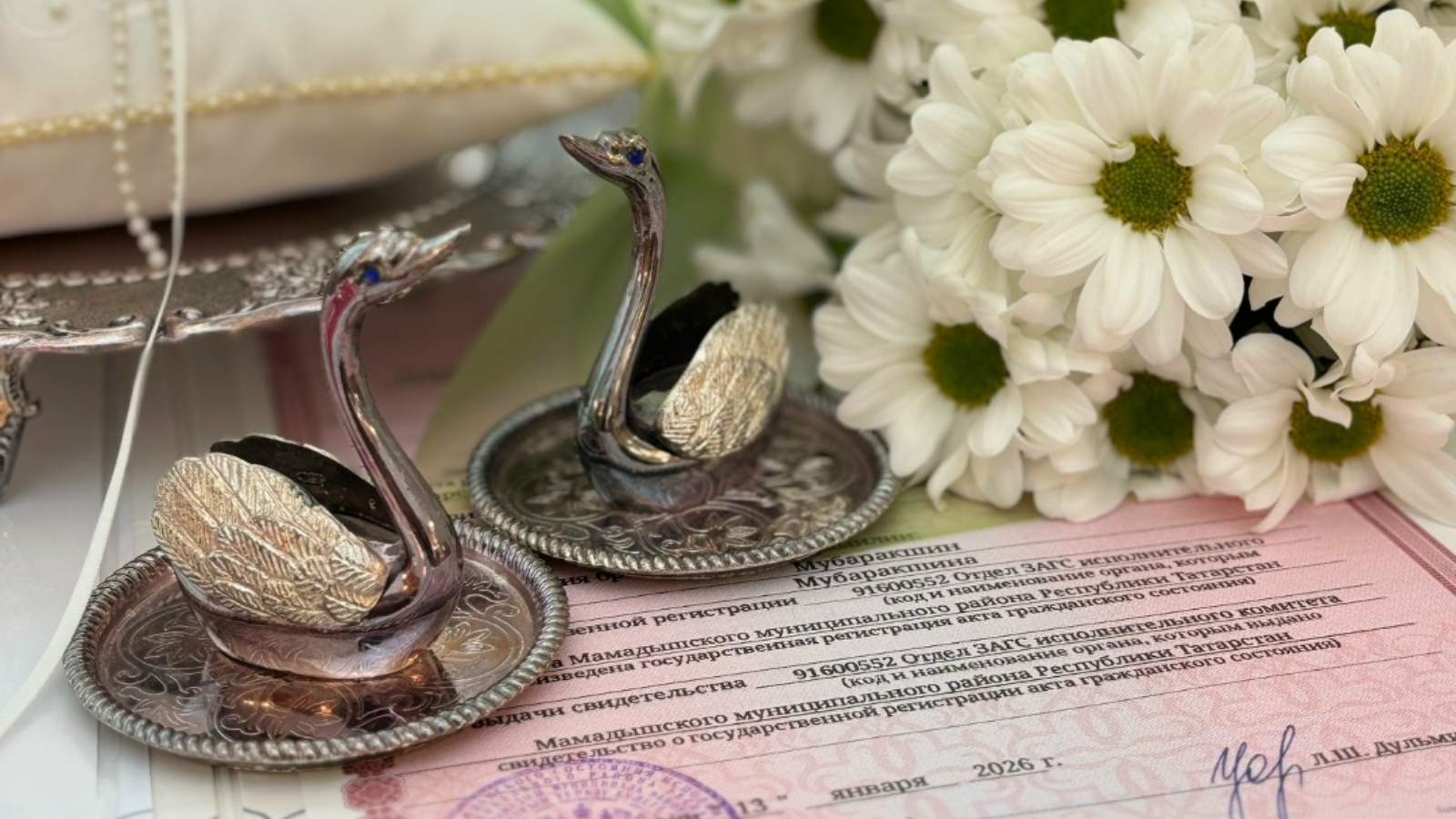 13 января во Дворце бракосочетания Мамадыша состоялась первая церемония заключения брака в новом, 2026 году. Первой парой, вписавшей свои имена в брачную книгу, стали Рустам и Гульнара Мубаракшины. Их союз стал особым примером: жениху — 48 лет, невесте — 42.