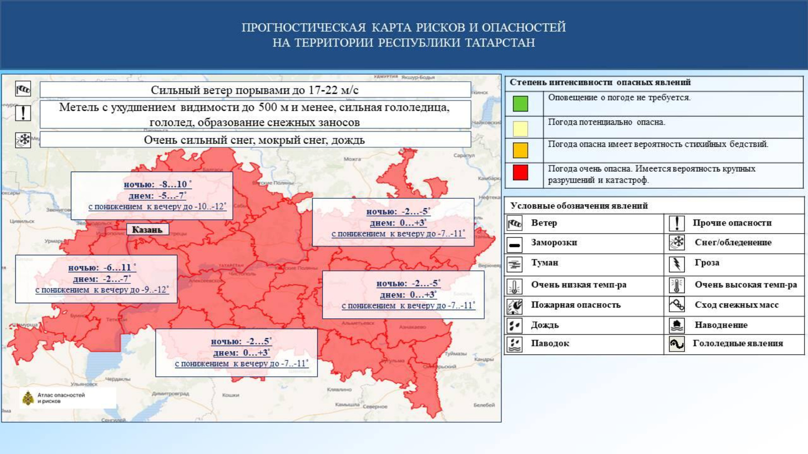 Вечером 16 февраля, в течение суток 17 февраля 2026 г. на территории Республики Татарстан ожидаются сильные осадки в виде снега, мокрого снега, в отдельных районах с дождем, метели с ухудшением видимости до 500 метров и менее, сильный ветер порывами 17-22 м/с, местами гололед, на дорогах снежные заносы и сильная гололедица.