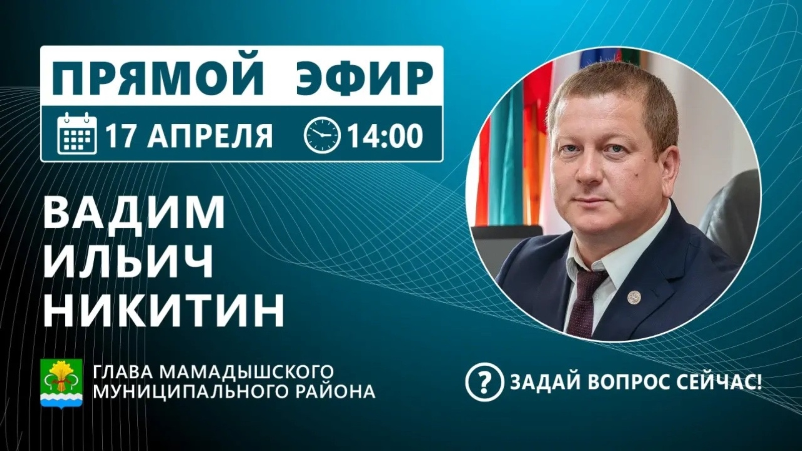 17 апреля в 14:00 в сообществе «Мамадышский муниципальный район» состоится прямая трансляция с главой Мамадышского района Вадимом Никитиным.