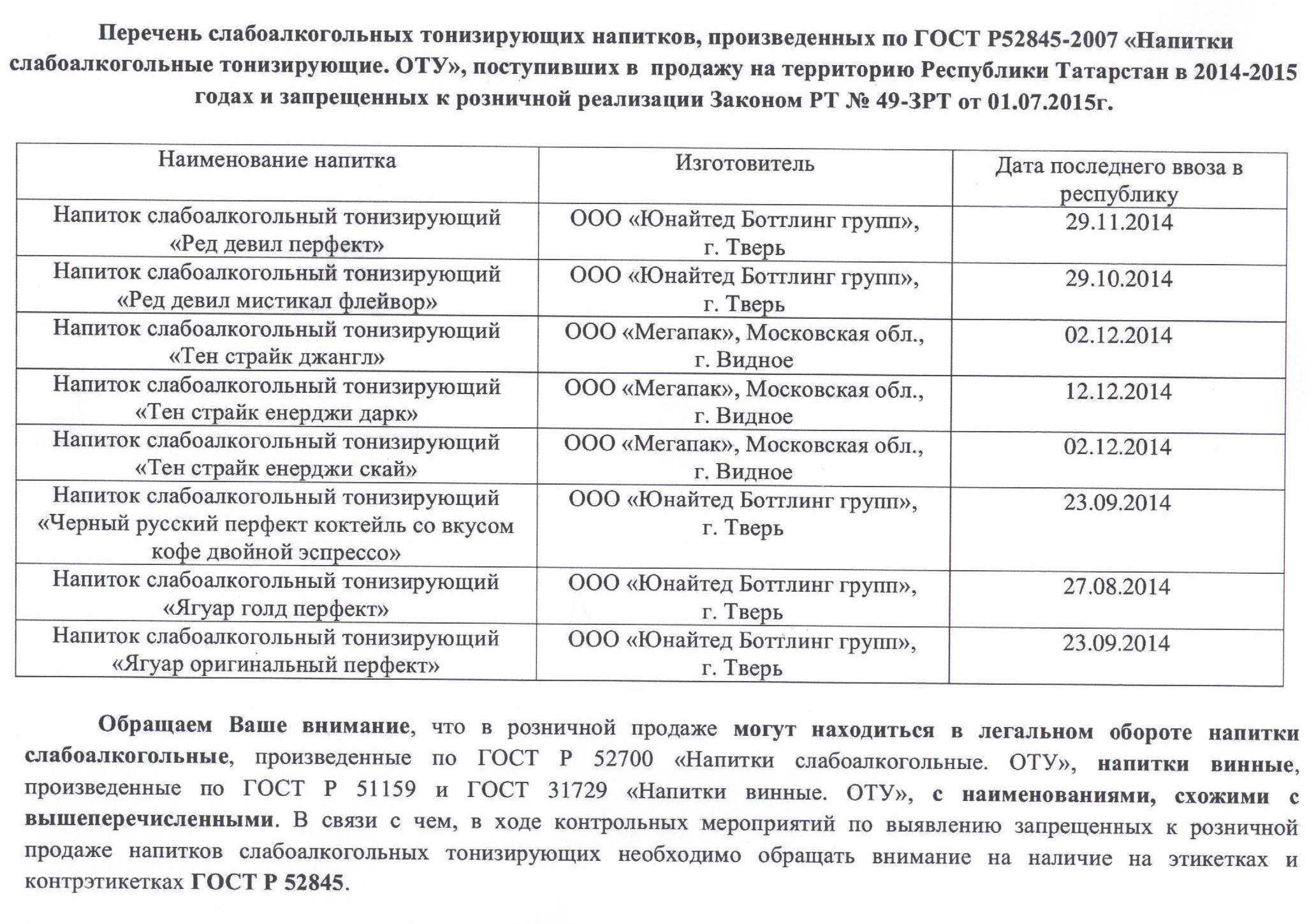 На территории Республики Татарстан запрещается розничная продажа слабоалкогольных тонизирующих напитков, под которыми понимается алкогольная продукция с содержанием этилового спирта от 1,2 до 9 процентов объема готовой продукции, содержащей кофеин и (или) другие тонизирующие компоненты в соответствии с национальным стандартом Российской Федерации ГОСТ Р 52845-2007 «Напитки слабоалкогольные тонизирующие. Общие технические условия».