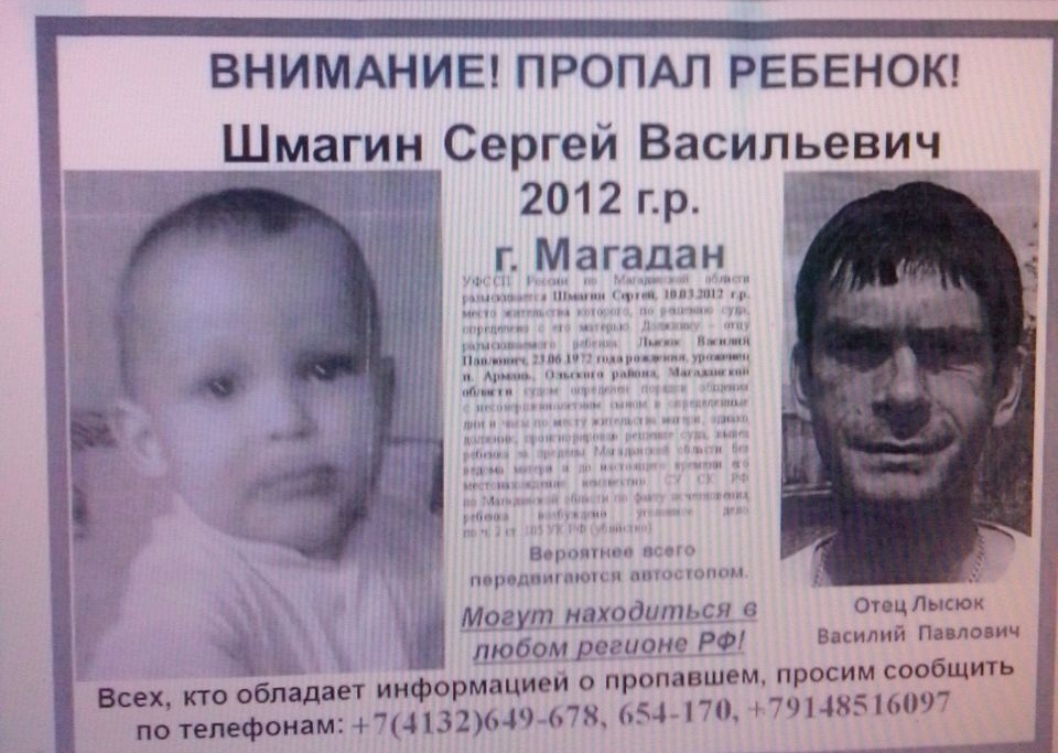 УФССП России по Магаданской области разыскивается Шмагин Сергей, 10.03.2012 года рождения, место жительства которого, по решению суда, определено с его матерью. Должнику — отцу разыскиваемого ребенка: Лысюк Василий, Павлович, 23.06 1972 года рождения, уроженец п. Армань, Ольского района, Магаданской области судом определен порядок общения с несовершеннолетним сыном в определенные дни и часы по месту жительства матери, однако должник, проигнорировав решение суда, вывез ребенка за пределы Магаданской области без ведома матери и до настоящего времени его местонахождение неизвестно. СУ СК РФ по Магаданской области по факту исчезновения ребенка возбуждено уголовное дело по ч. 2 ст. 105 УК РФ (убийство).