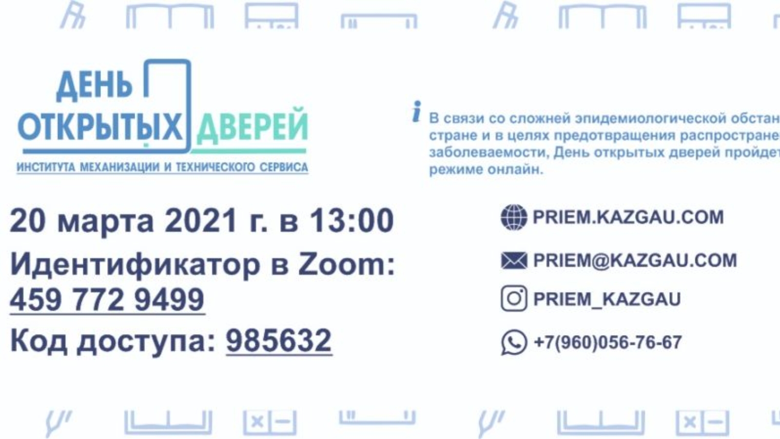 20 мартта 13: 00 сәгатьтә Казан дәүләт аграр университеты Татарстан Республикасы Авыл хуҗалыгы һәм азык-төлек министрлыгы ярдәме белән онлайн форматында механикалаштыру һәм техник сервис институтының Ачык ишекләр көне үткәрәчәк.