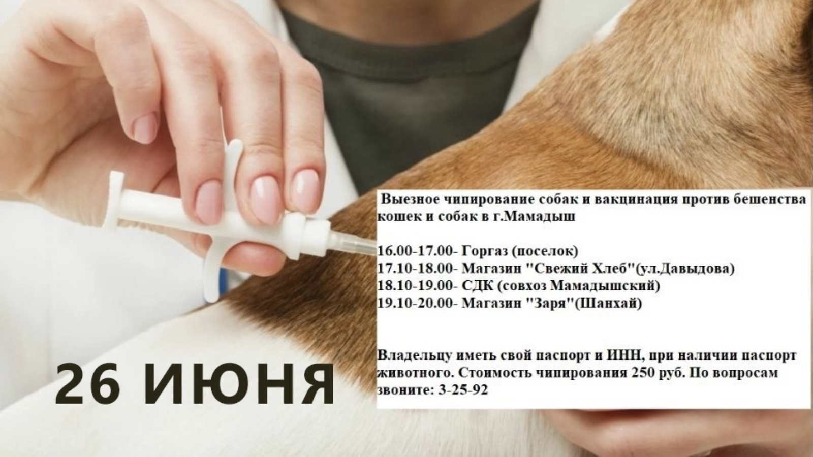 2025 елның 26 июнендә Мамадышта йорт хайваннарын котыру авыруына каршы мәҗбүри теркәү, чиплау һәм вакцинацияләү буенча мобиль пунктлар чыгачак. Көн дәвамында "Мамадыш РДВБ" ДБУ белгечләре шәһәрнең төрле нокталарында эшләячәк, анда хуҗалар үзләренең хайваннары — этләре һәм мәчеләре белән килә алачак.